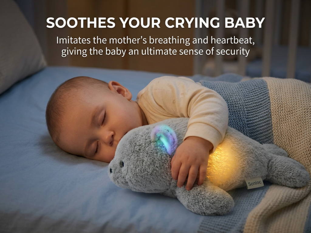 This innovative soothing companion is designed to calm crying babies by simulating a mother’s natural breathing rhythm and heartbeat. By recreating the familiar sounds babies experienced in the womb, it provides a deep sense of security and emotional comfort. The gentle glowing light and ultra-soft plush texture further enhance the calming effect, helping infants relax more quickly and settle into restful sleep.