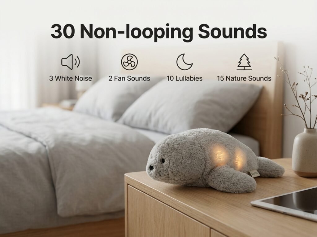 Enjoy a rich selection of 30 soothing, non-looping sounds — including white noise, fan sounds, lullabies, and nature audio. Designed to help your baby fall asleep faster and stay asleep longer, without distracting audio breaks.